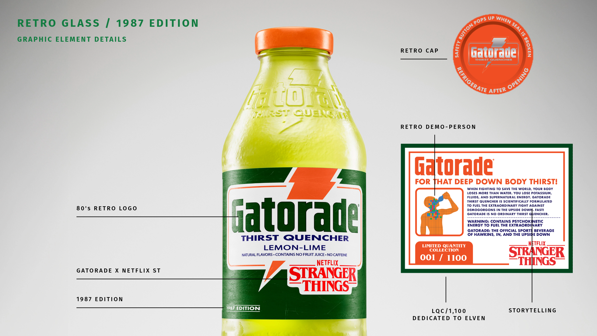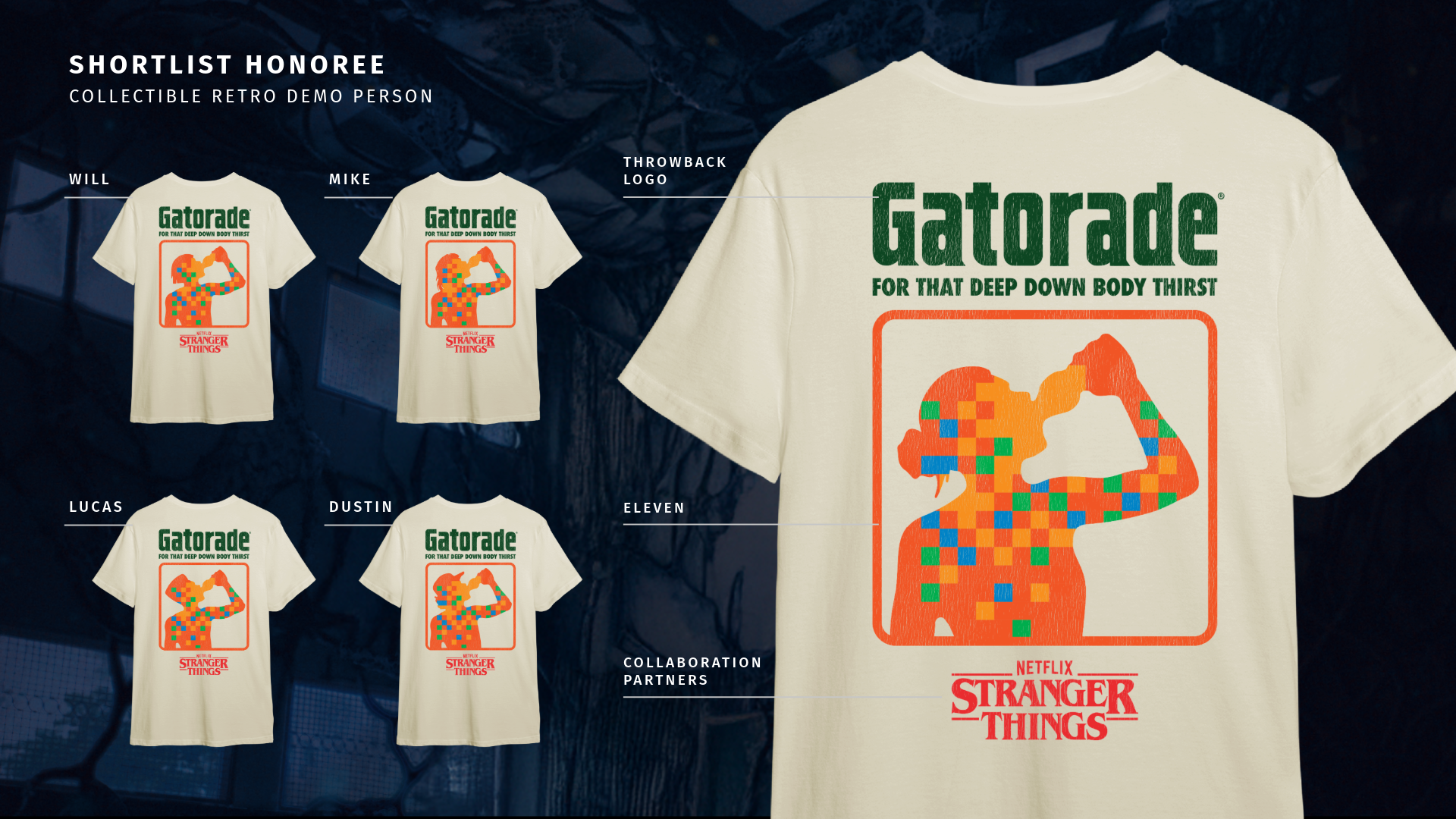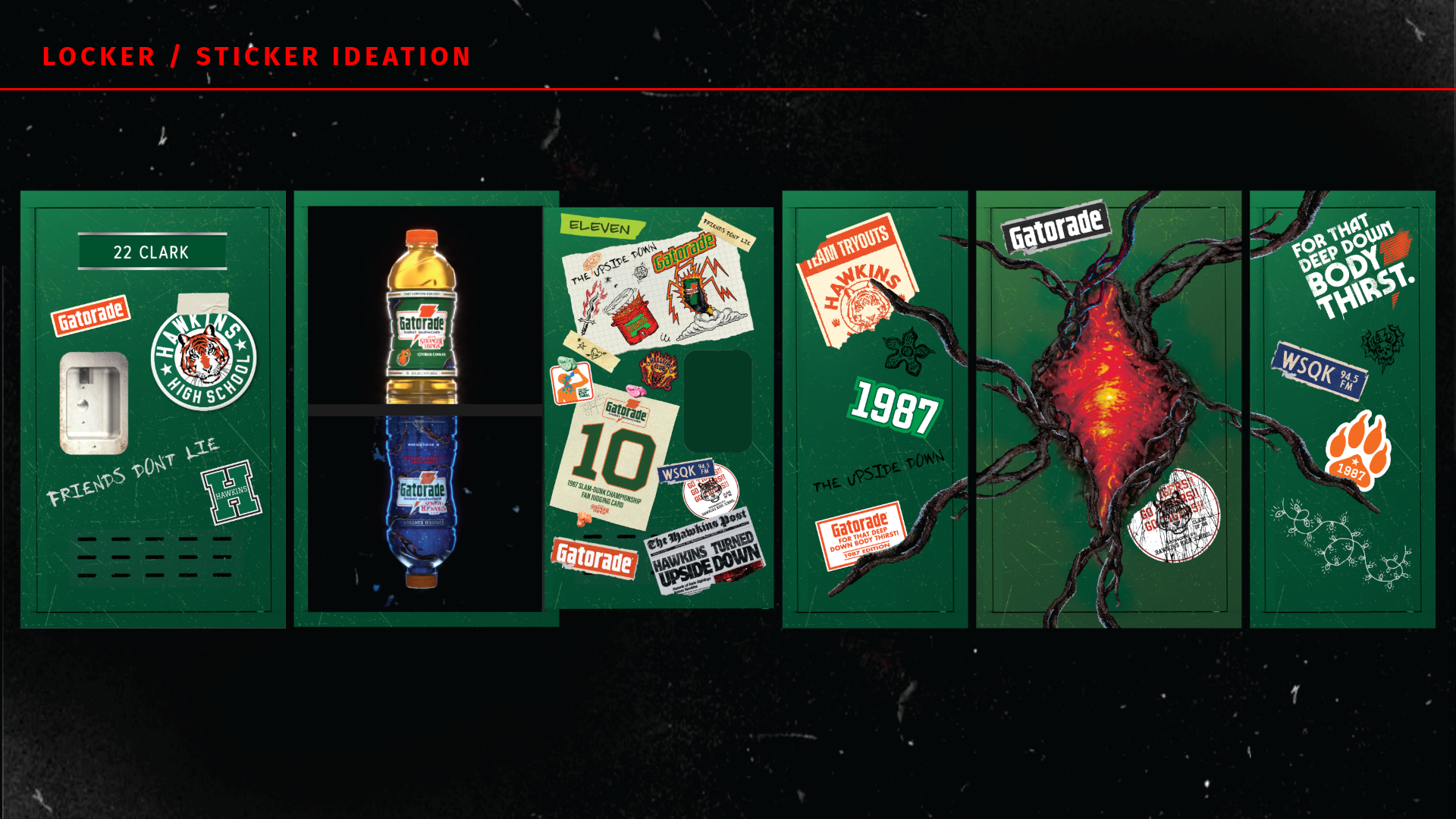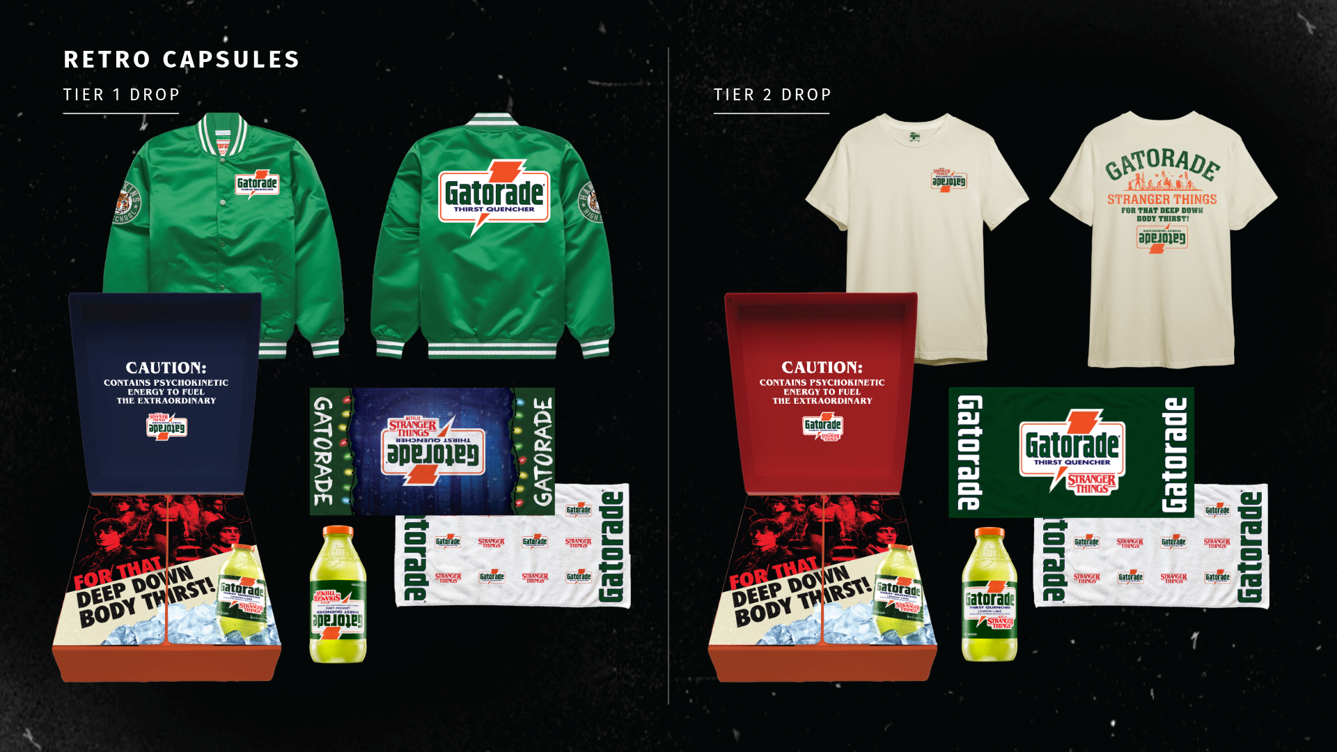 For the final season of Stranger Things, Netflix partnered with Gatorade to create a fully integrated marketing campaign. Set in 1987—a peak era for Gatorade—the brand was written directly into the show’s script, cementing its role in the story world. Our team developed limited-edition bottles, retail experiences, capsule collections, social and digital assets, immersive events, and custom influencer kits for pro athletes. My primary contributions focused on the capsule collections and the design of the influencer kits.
