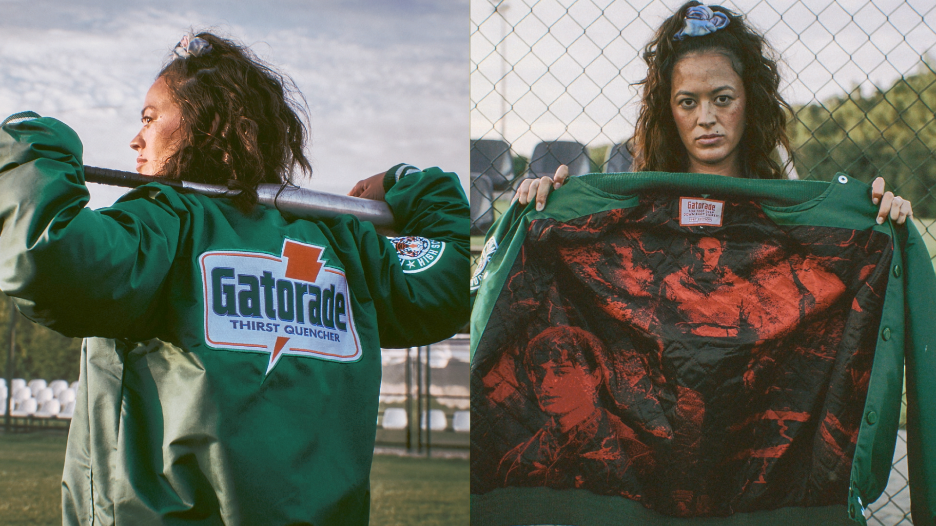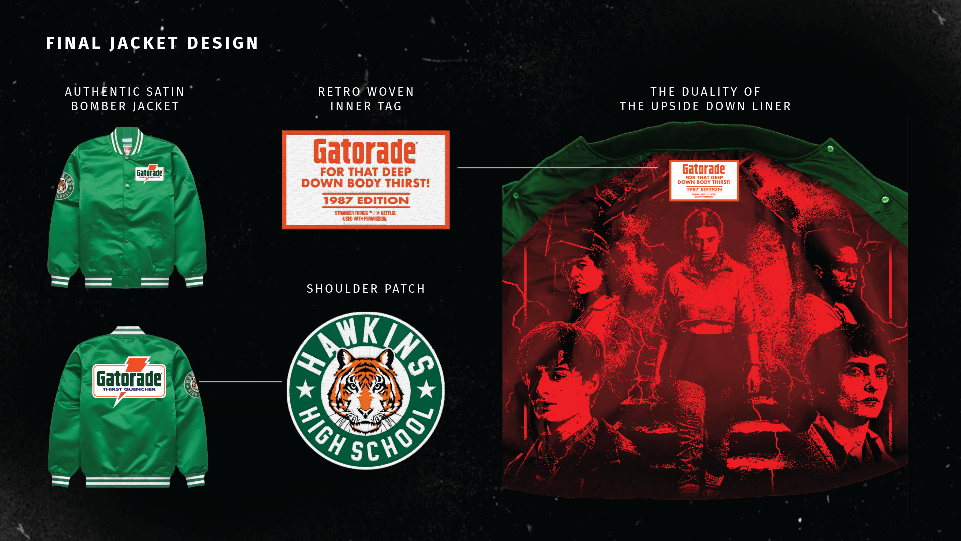 Here are the final Retro Capsules, which include a jacket or t-shirt, a towel, and a limited-edition bottle. For the Tier 1 Drop, the shipper design pulls straight from Gatorade’s roots, using artwork inspired by a vintage Gatorade ad and paired with Stranger Things–themed messaging: “Caution: Contains psychokinetic energy to fuel the extraordinary.” The towel design references the classic alphabet lights from Season 1 of Stranger Things—the ones Winona Ryder’s character used to communicate across dimensions. Rounding out the capsule is a limited run of 1,100 glass bottles, a subtle nod to Eleven, making each bottle a collectible blend of retro Gatorade heritage and Stranger Things lore.