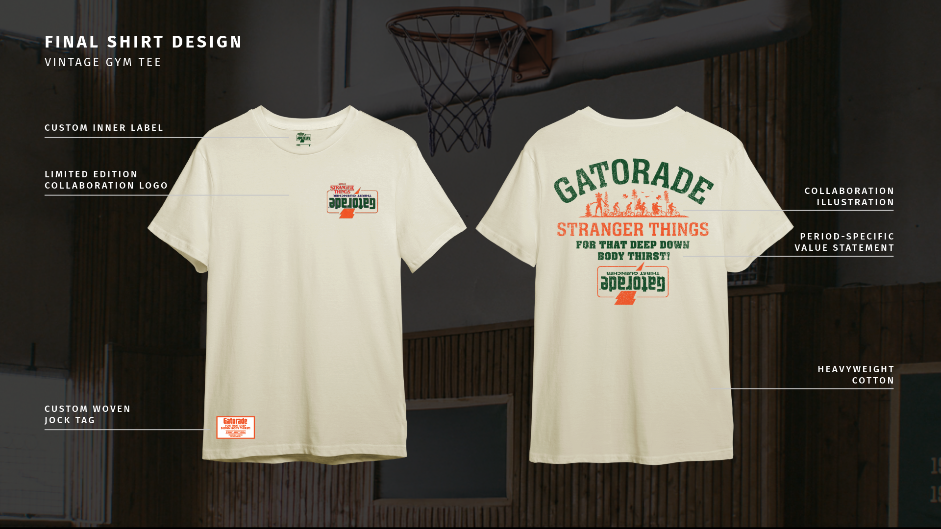 We found the relationship with sports between Gatorade and Hawkins High School to be immediately recognizable. The shirt is off-white with distressed graphics to emphasize its wear and tear. We looked at several different shirt weights and colors to get the perfect look and feel.